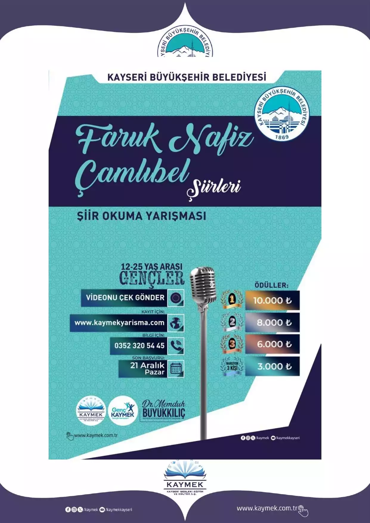 Kayseri Büyükşehir Belediyesi tarafından düzenlenen Faruk Nafiz Çamlıbel Şiirleri Okuma Yarışması için başvurular başlamıştır. 12–25 yaş arası tüm öğrencilerimiz yarışmaya katılabilir.