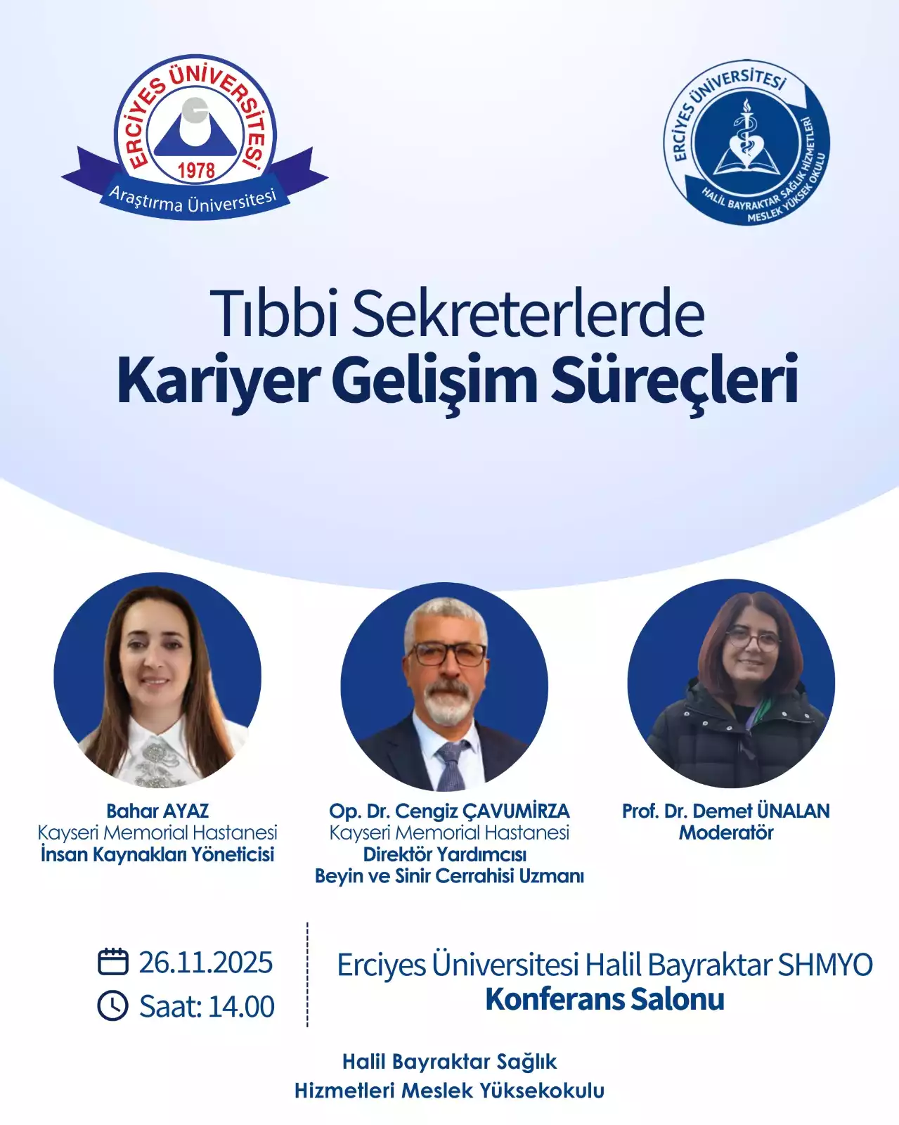 Erciyes Üniversitesi Halil Bayraktar Sağlık Hizmetleri Meslek Yüksekokulu tarafından düzenlenen “Tıbbi Sekreterlerde Kariyer Gelişim Süreçleri” konulu konferansa tüm öğrencilerimiz ve ilgililer davetlidir.