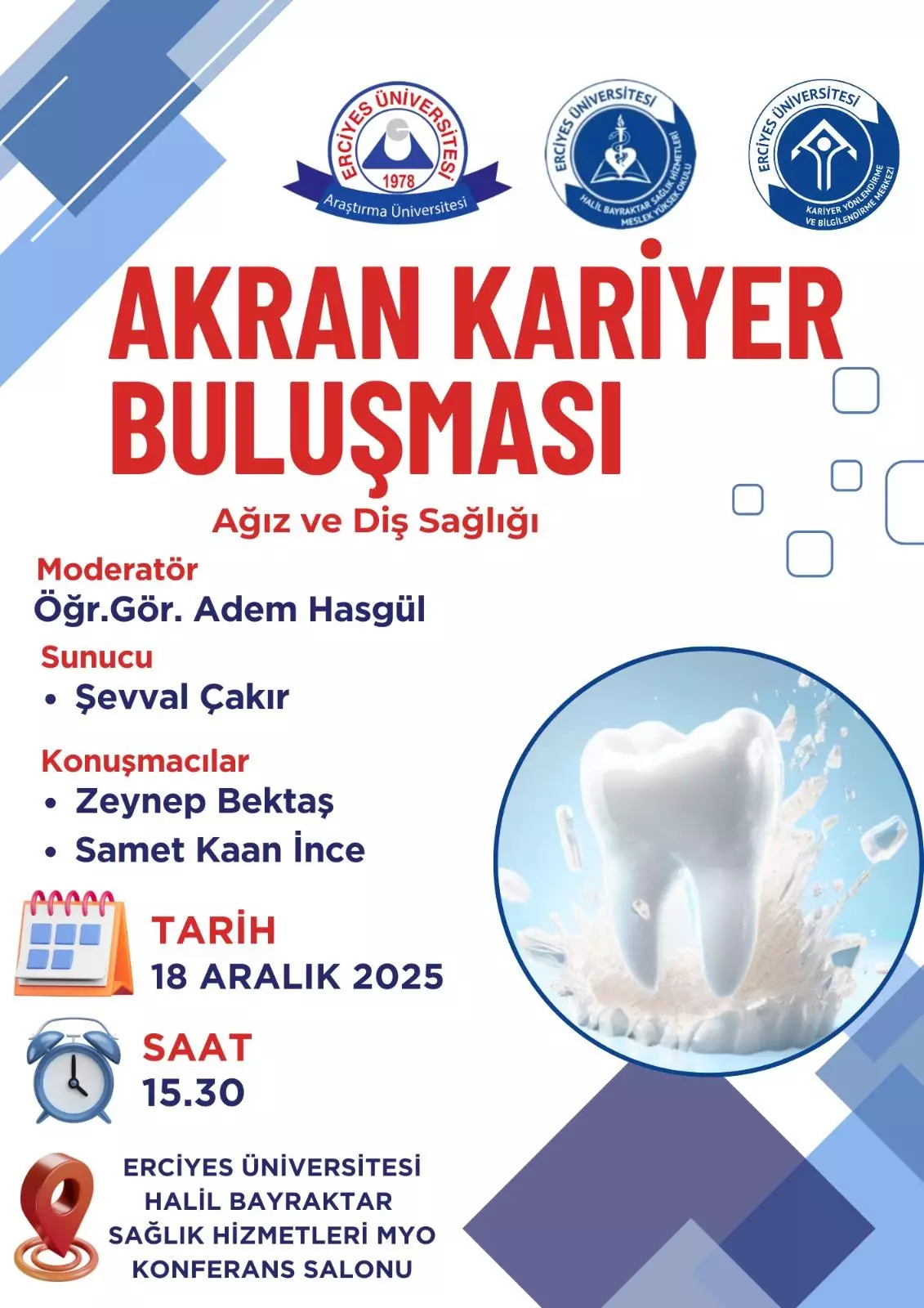 Erciyes Üniversitesi tarafından düzenlenen Akran Kariyer Buluşması etkinliği, Ağız ve Diş Sağlığı programı öğrencileri için kariyer yolculuklarına ışık tutmayı amaçlıyor. Mezun ve öğrenci konuşmacıların deneyimlerini paylaşacağı bu buluşmaya tüm öğrencilerimiz davetlidir.