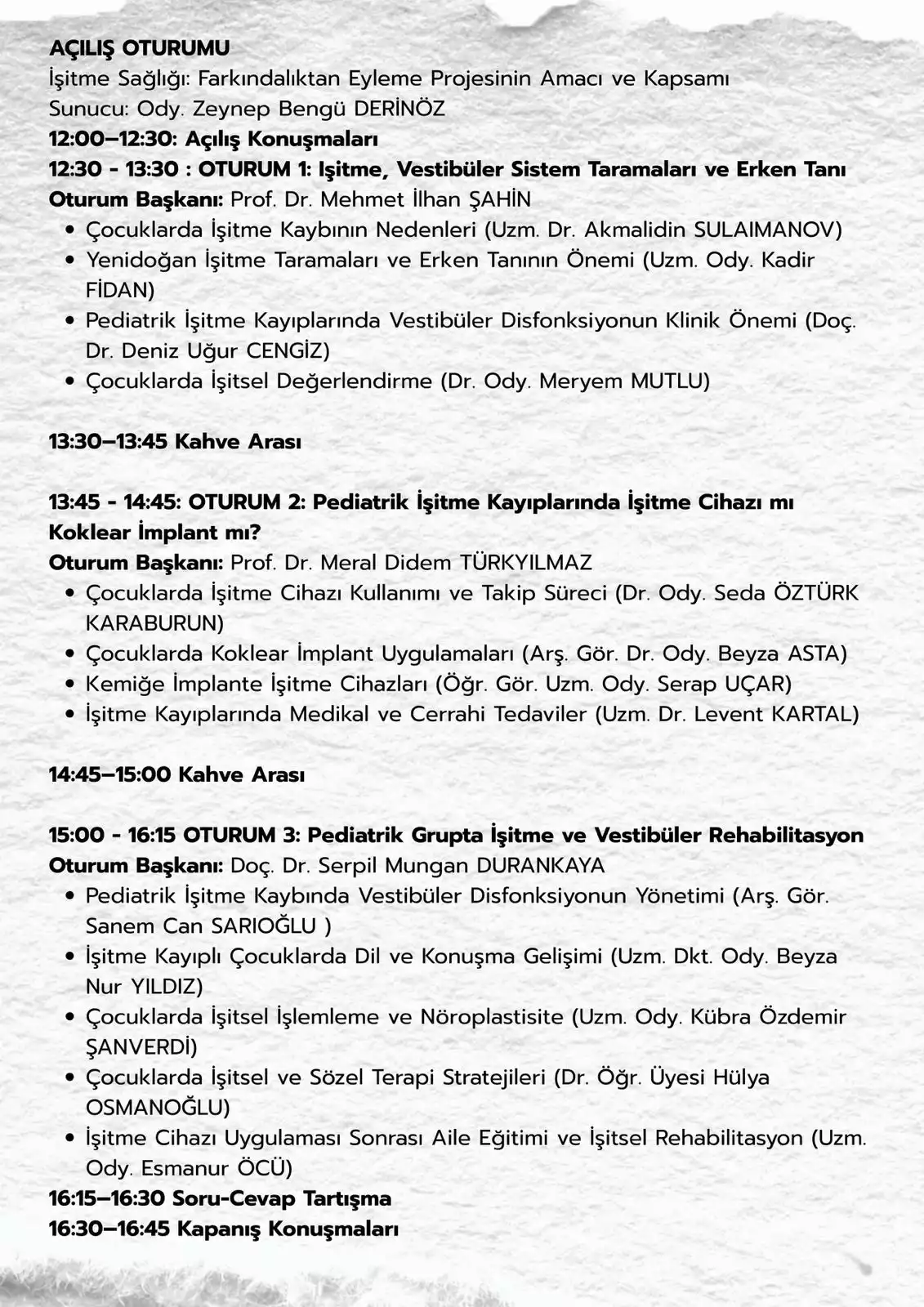 Sempozyum, alanında uzman akademisyenler ve sağlık profesyonellerinin katılımıyla gerçekleştirilecek olup; işitme kayıpları, erken tanı süreçleri, pediatrik işitme değerlendirmeleri, işitme cihazları ve koklear implant uygulamaları ile rehabilitasyon yaklaşımları gibi güncel ve önemli konular ele alınacaktır.