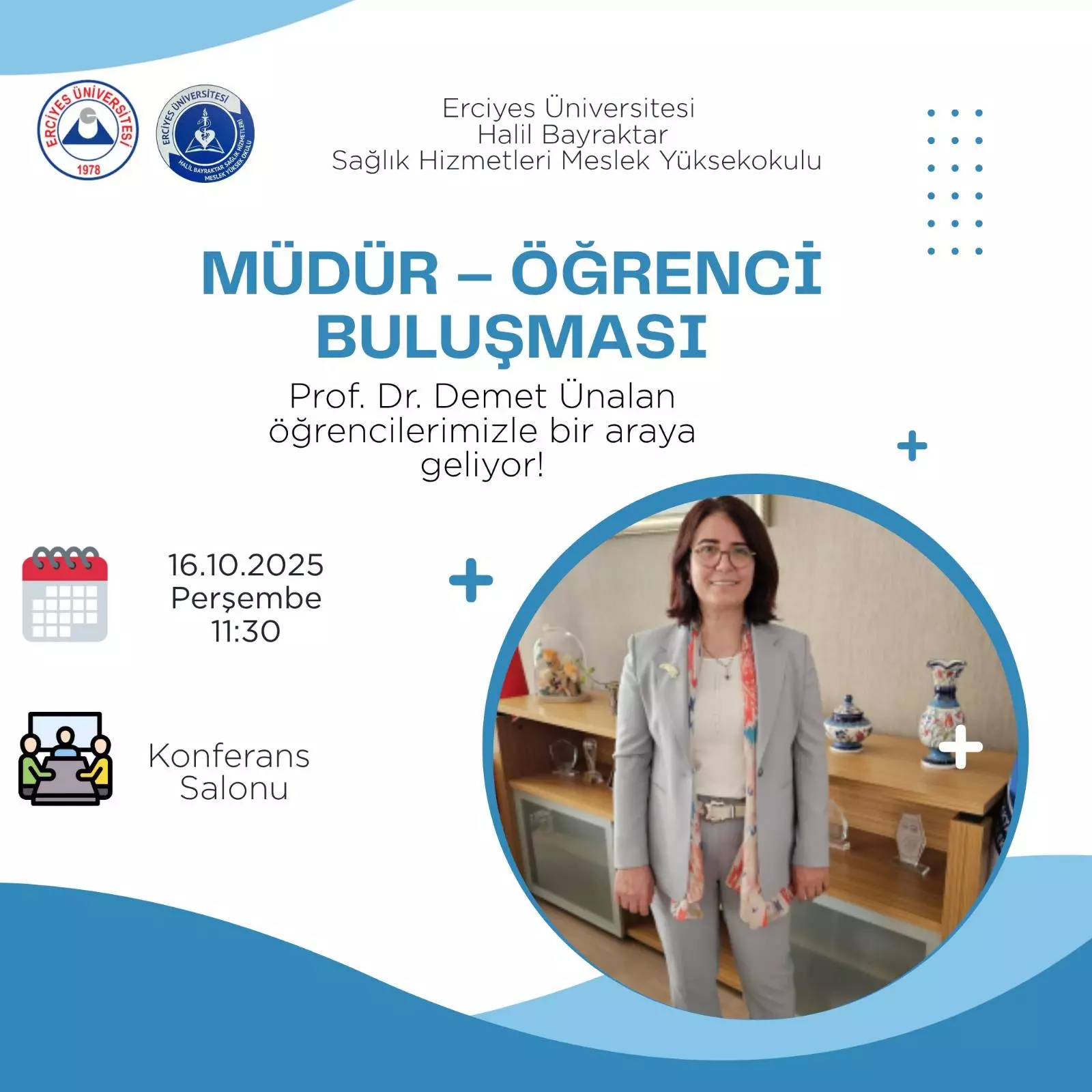 Erciyes Üniversitesi Halil Bayraktar Sağlık Hizmetleri Meslek Yüksekokulu tarafından düzenlenen “Müdür - Öğrenci Buluşması” etkinliği, 16 Ekim 2025 Perşembe günü saat 11.30’da Konferans Salonu’nda gerçekleştirildi.